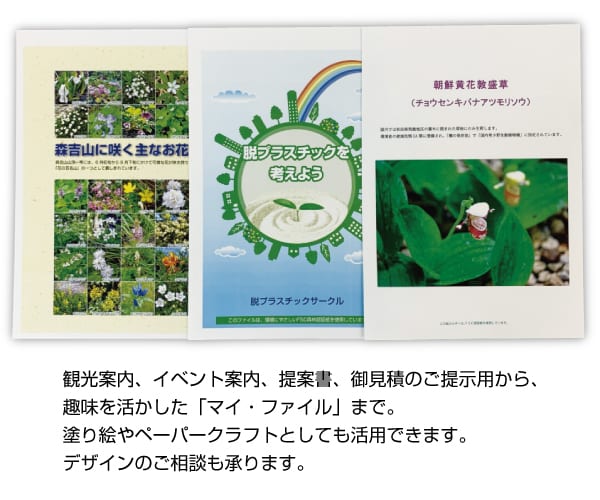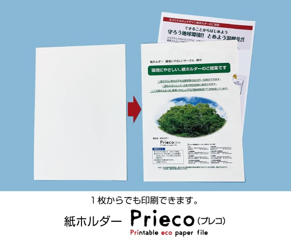 パソコンで作成したデザインをもとに、一点一様で簡単にオリジナルの紙ホルダーが作成できます。FSC認証紙を使用しており、インクジェット用紙でリサイクル可能な地球環境に配慮した製品です。製品の表面の筆記適性はもとより、レーザプリンタ、インクジェットプリンタ等の適性もあり、各種イベントやセミナー等の配布用途でも活用できます。また、社内で使用するクリアファイルを環境に配慮したFSC認証品の紙ホルダー使用を推奨することによりプラスチック削減に取り組んでいます。