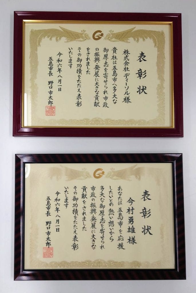 2024.08.01社会貢献五島市長より感謝状を受け取りました表彰状株式会社ディーソル様貴社は五島市へ多大な御厚意を寄せられ市政の振興・発展に 大きな貢献をされました その御功績をたたえ表彰いたします 令和六年八月一日五島市長 野口市太郎表彰状今村勇雄殿あなたは五島市を応援したいとの熱い想いから多大な御厚意を寄せられ 市政の振興・発展に大きな貢献をされました その御功績をたたえ表彰いたします 令和六年八月一日五島市長 野口市太郎 ニュース一覧へ戻る