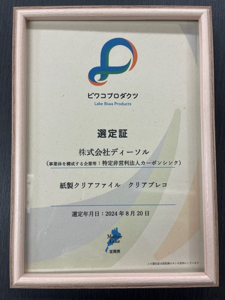 このたび株式会社ディーソル製品である紙製クリアファイル「クリアプレコ」が、「ビワコプロダクツ」に選定されました。